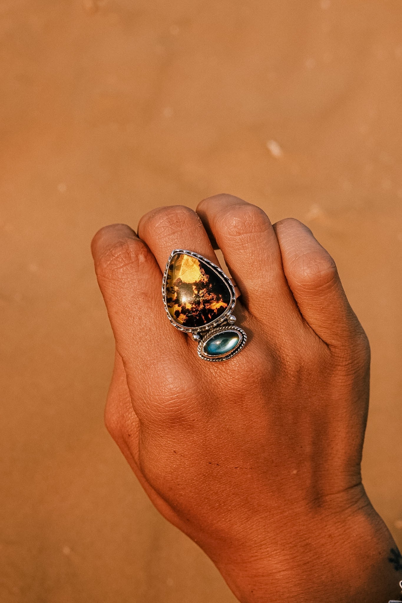Adjustable 925 Silver Ring with Mexican Amber & Rainbow Moonstone