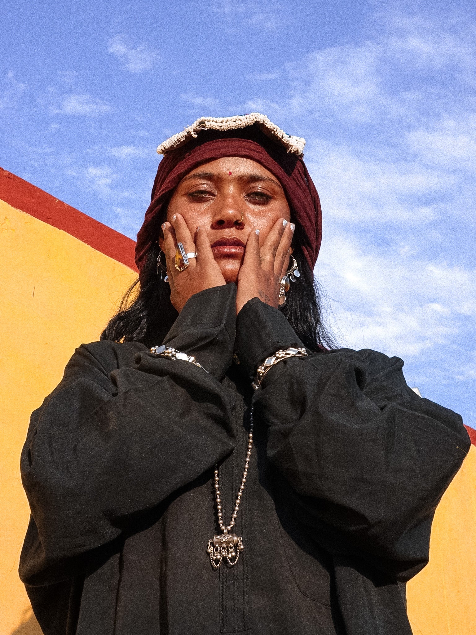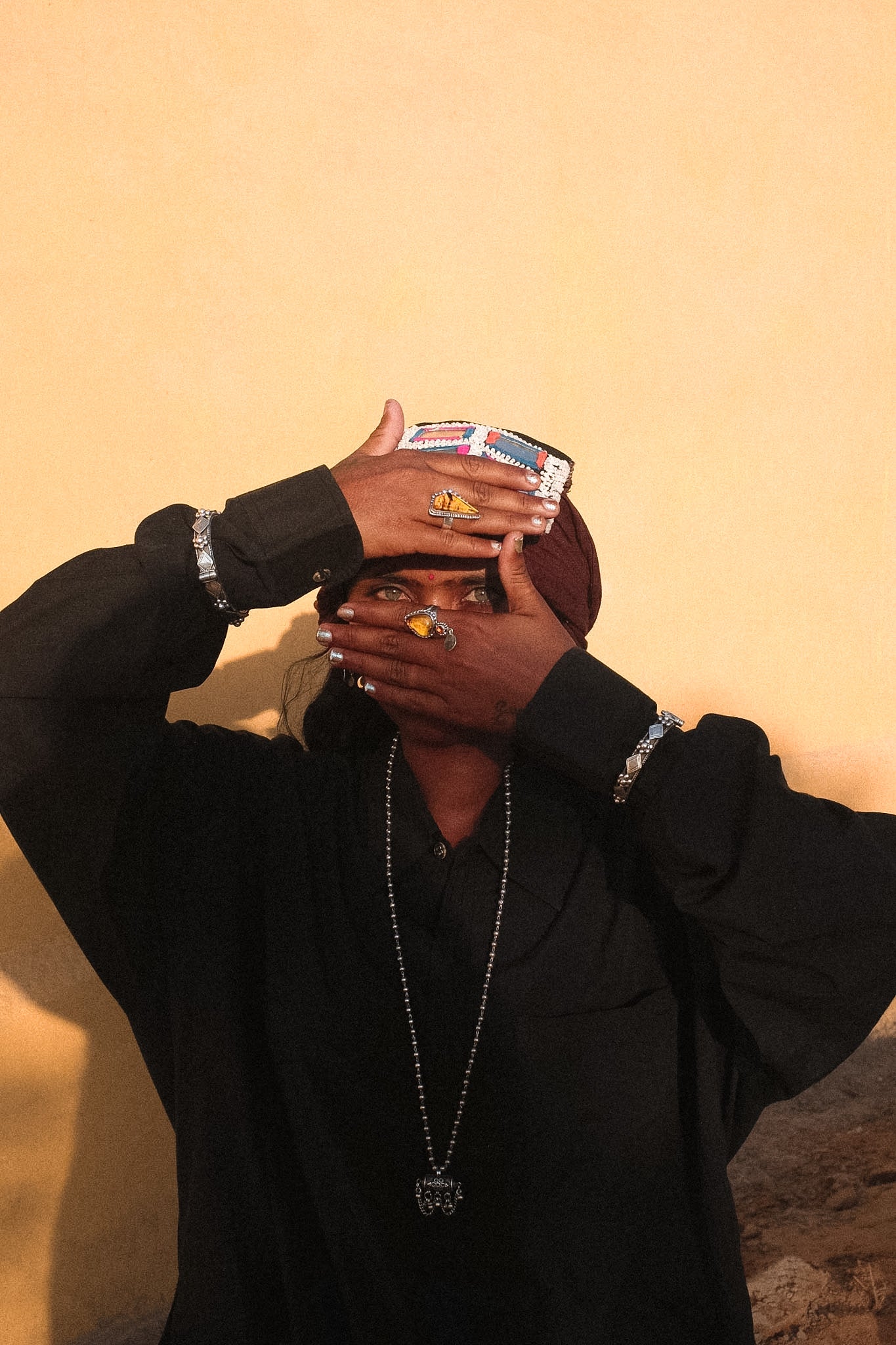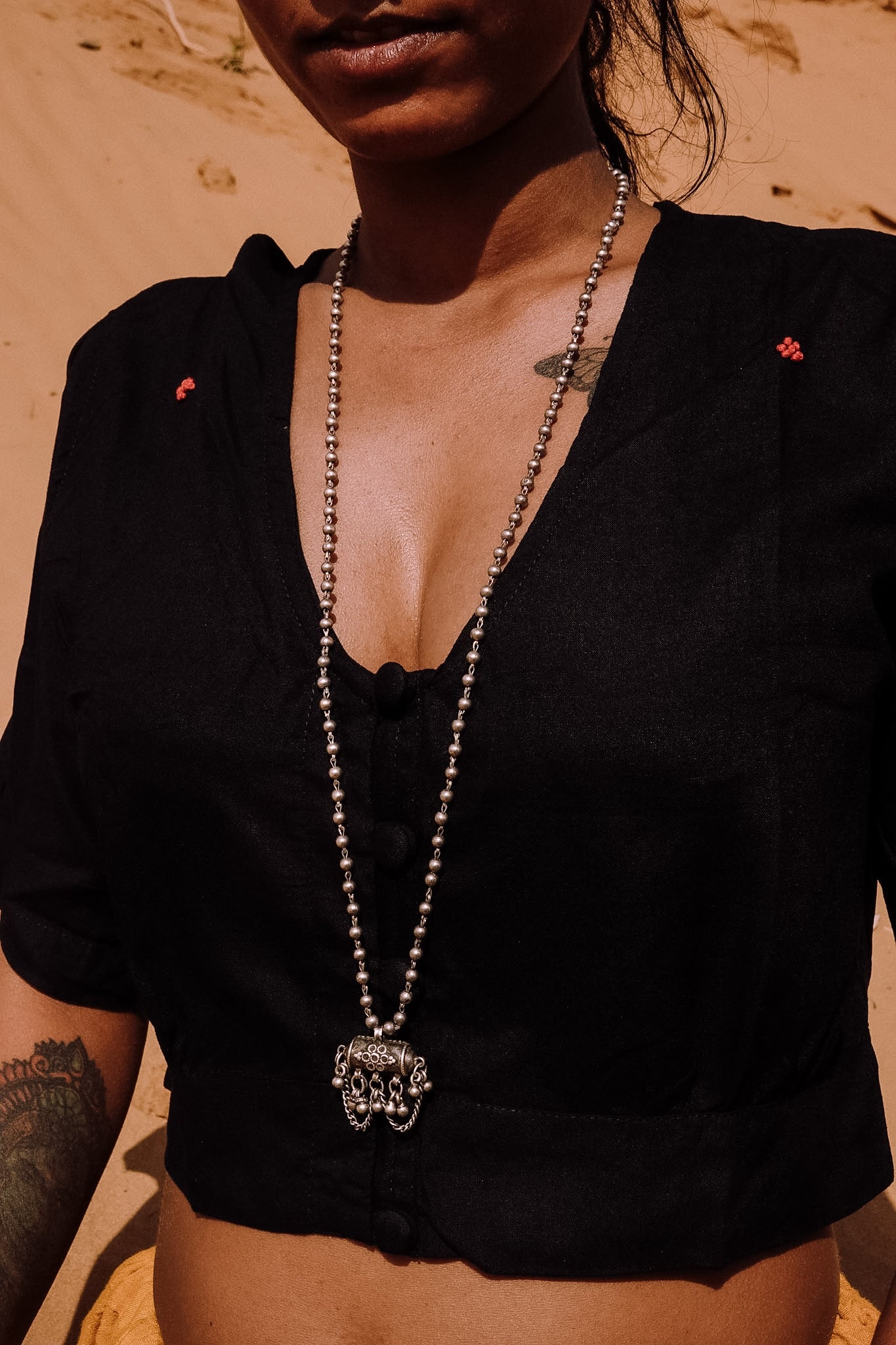 In this piece, the taweez is designed to be worn on both sides, not fixed to a single front, allowing it to shift with movement, rather than stay in one position.