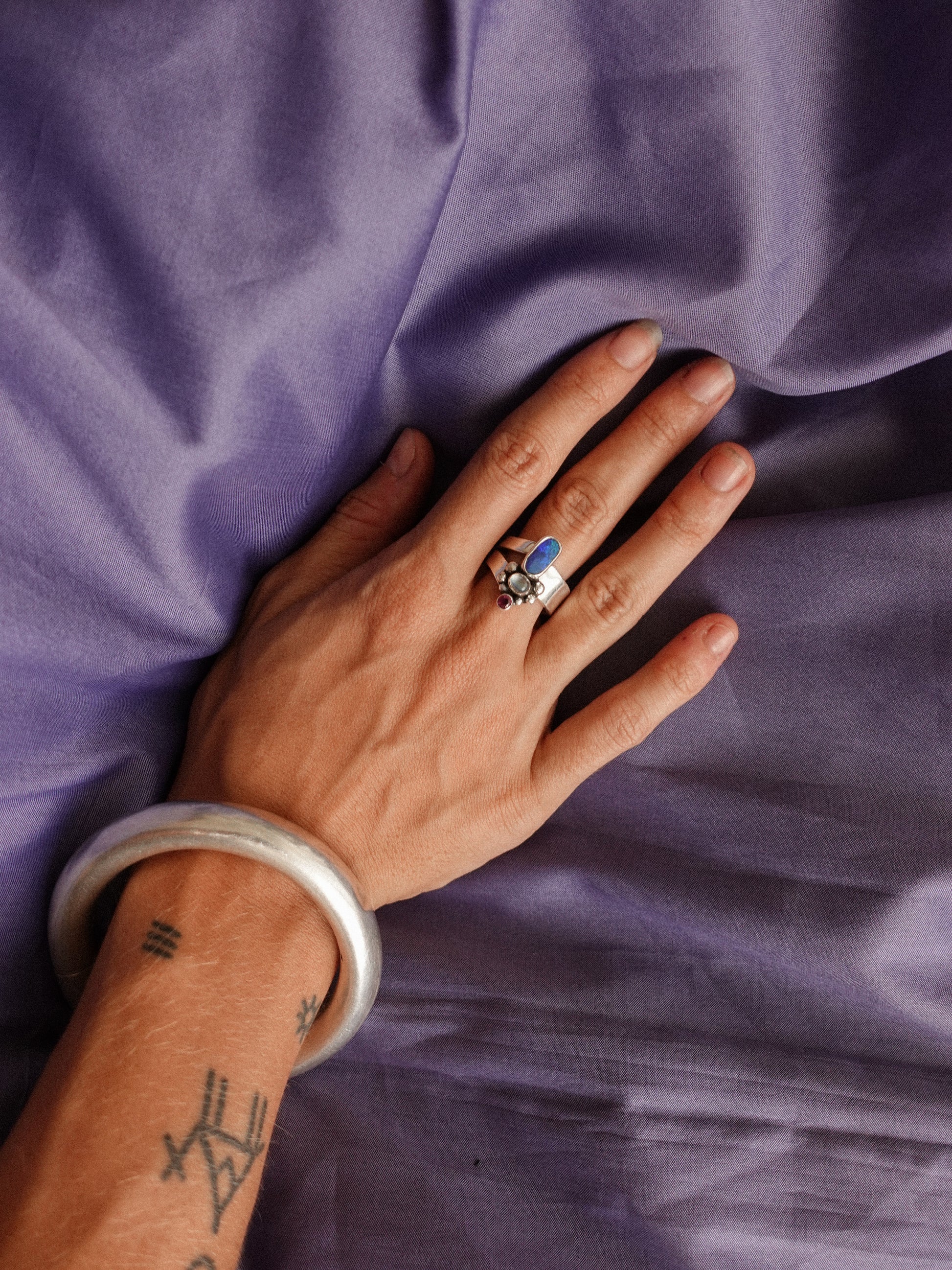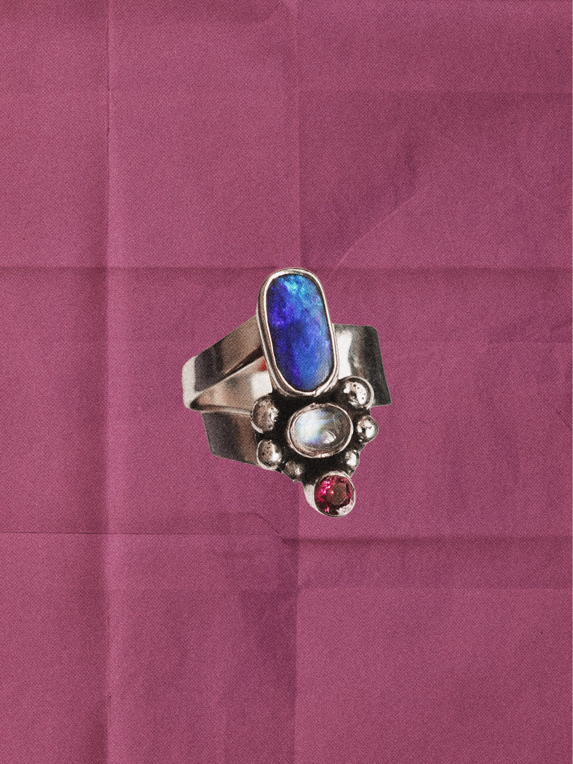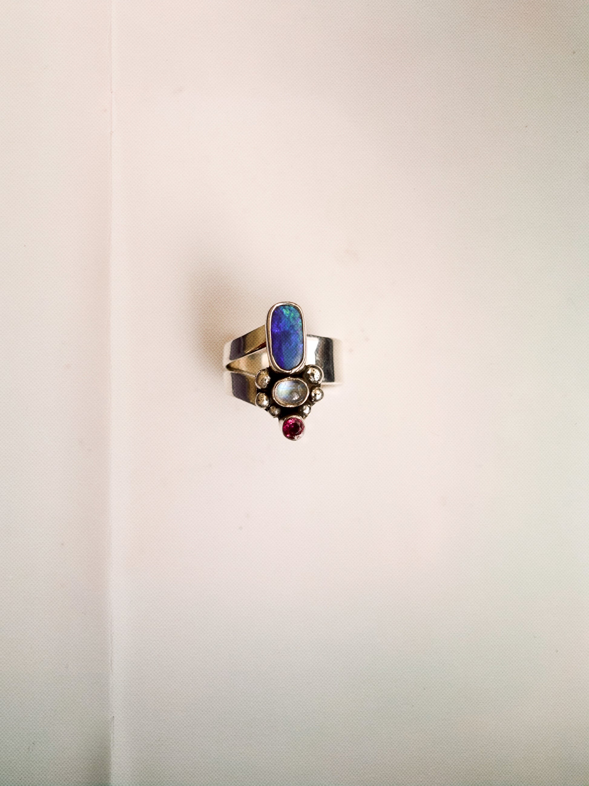 N78- Australian Opal, Rainbow Moonstone, faceted Turmaline Silver 925 Adjustable Ring