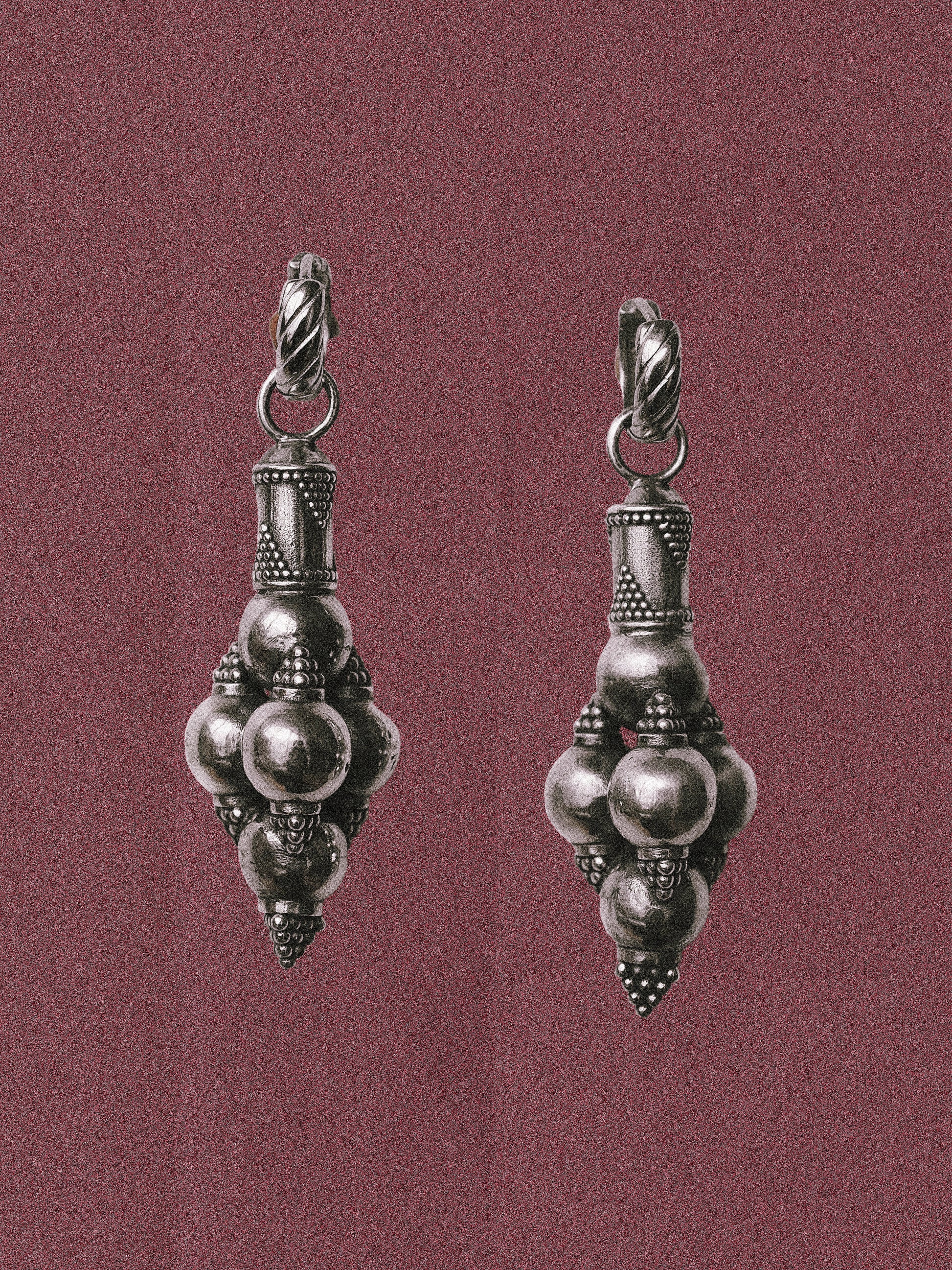 Inspired by the Neo-Elamite grape-cluster earrings preserved at the Louvre Museum, Department of Oriental Antiquities (Sb 5756).